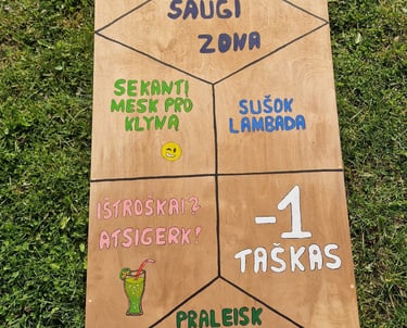 2. Tikslas – mesti maišelius taip, kad jie pataikytų į skylę arba liktų ant lentos. Pateikei į kažkurį langelį? Atlik užduotį!