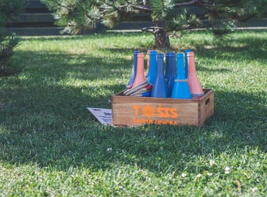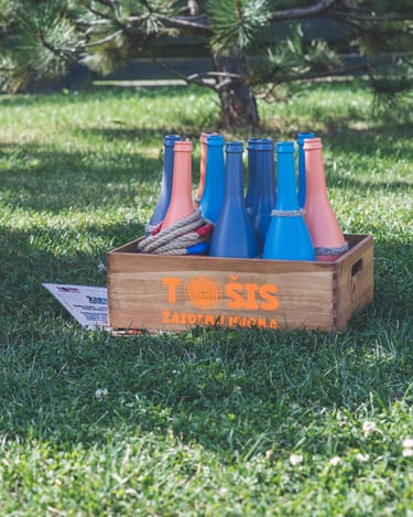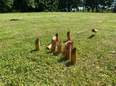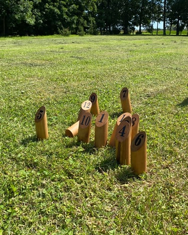 Komplektą „Akimirka“ sudaro: Cornhole, XXL Jenga, Molkky, Skylamūšis, Žiedynės ir Ladder Ball.