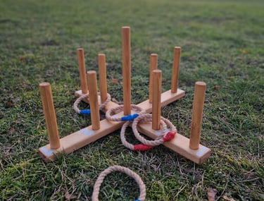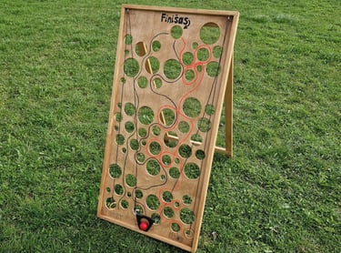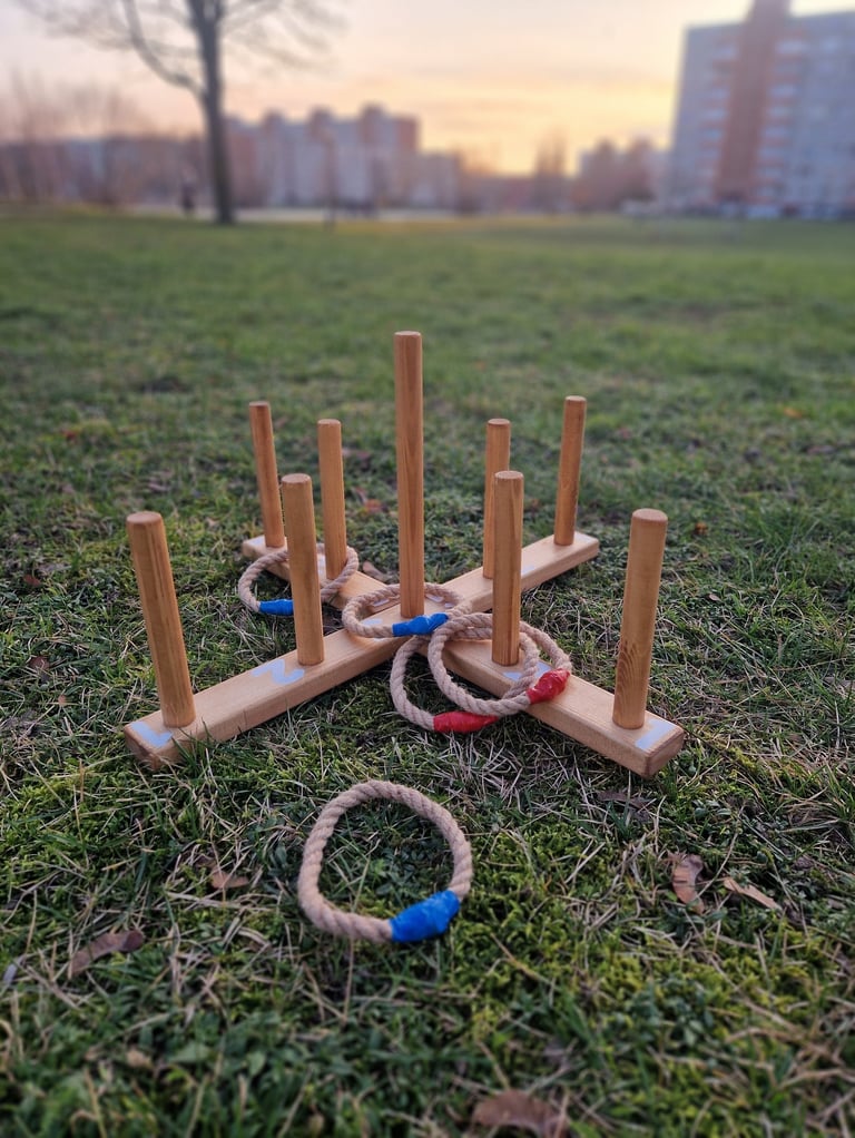 Komplektą „Dūzgės“ sudaro: Cornhole, XXL Jenga, Labirintas „Korys“, Ladder ball, Skylamūšis, Skardinmūšis, Kaubojaus žiedai.
