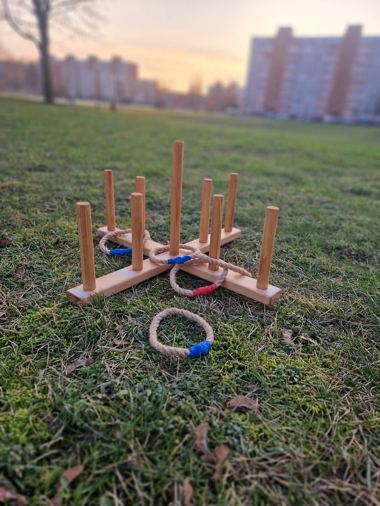 Komplektą „Sukūrys“ sudaro: Cornhole, XXL Jenga, Skylamūšis, Kaubojaus žiedai ir Skardinmūšis.