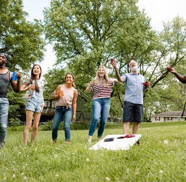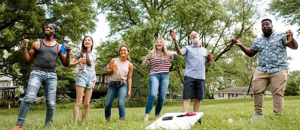 Tradicinis Cornhole papildytas smagiomis užduotimis (pvz., sekantį mesk pro klyną).
