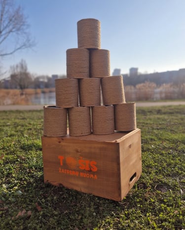 1. Atsistojame priešais skardinių bokštą apie 6-8 metrų atstumu. Kiekvienas žaidėjas turi po 5 metimo bandymus.